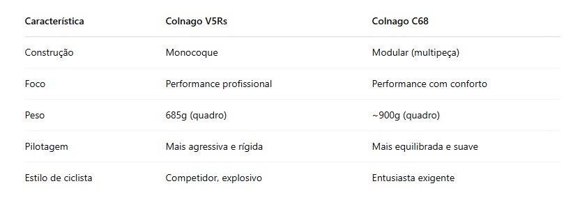 Apesar de ambas serem top de linha, a V5Rs e a C68 atendem perfis bem diferentes de ciclistas. Diferente do modelo C68, que tem construção modular (com várias peças interligadas), a V5Rs adota uma estrutura monocoque em fibra de carbono. Isso garante maior rigidez e menor peso. A filosofia de cada uma é distinta, veja na tabela abaixo.