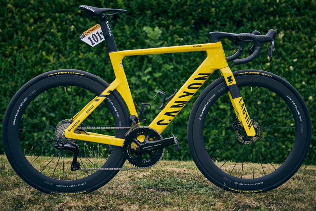 A bike aero principal do pelotão, customizada via programa MyCanyon, usada por Mathieu van der Poel nas etapas planas e TT .