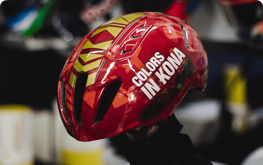 O capacete da Bontrager personalizado pelo estúdio Starling Design com o grafismo estilizado com o símbolo com muito significado para o Thiago. A famosa flecha que foi tatuada em seu braço direito no Hawai, logo após sua participação em Kona.
